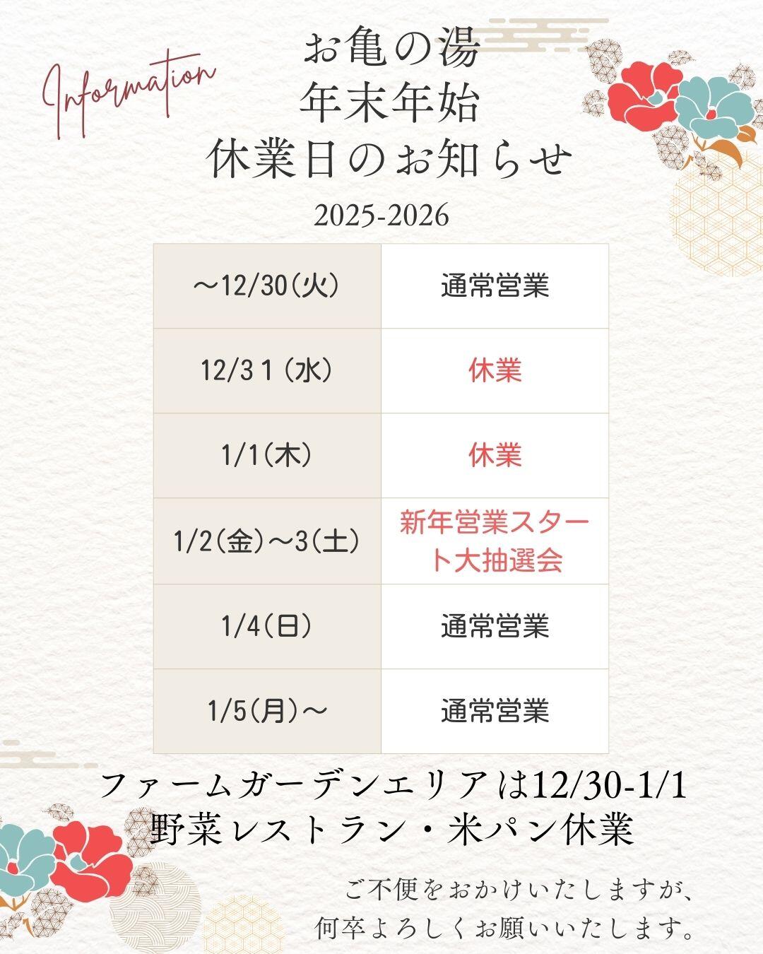 今年も残りわずかとなりましたね⛄️❄️ 「お亀の湯」年末年始の営業スケジュールをお知らせします🎍✨