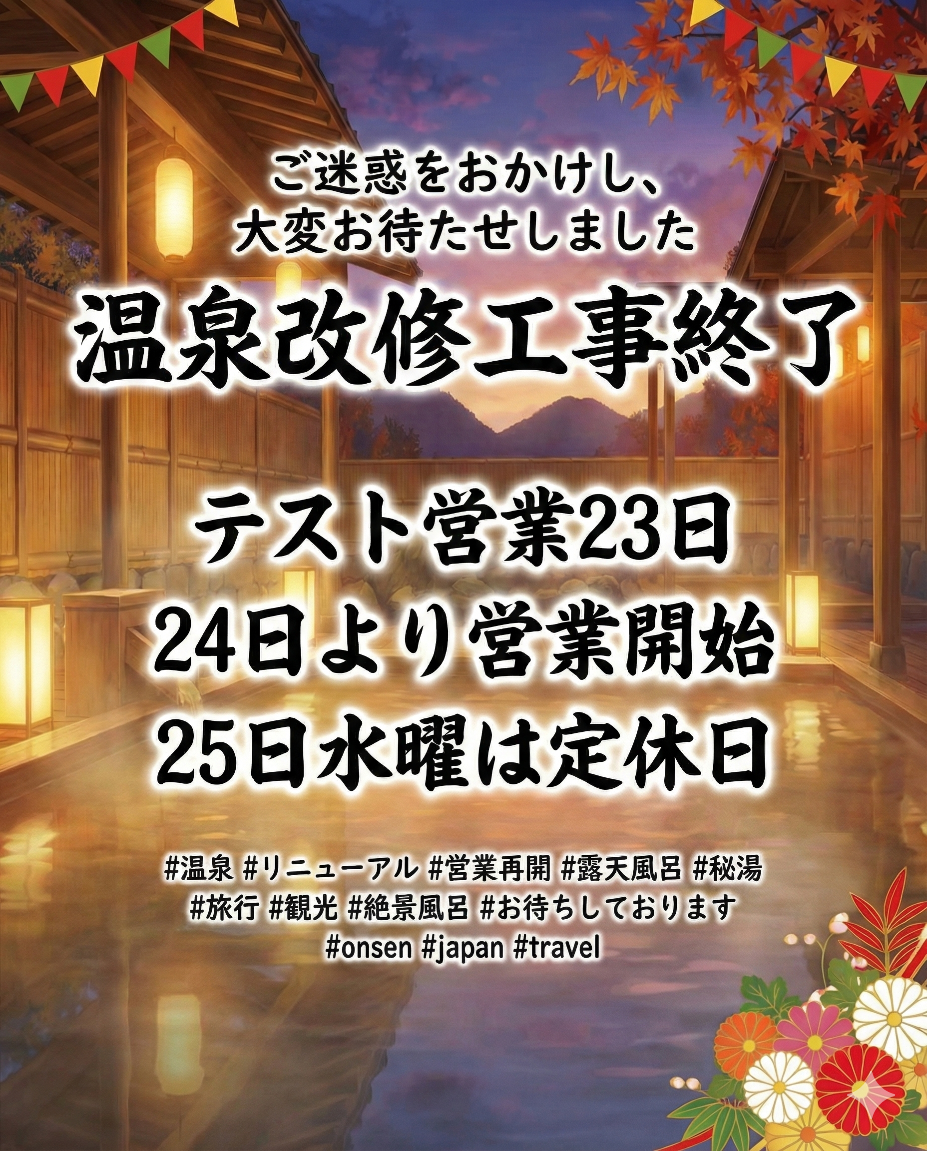 温泉を楽しむ キャンプを楽しむ 観光を楽しむ お知らせ 2026年02月22日(日) 温泉23日より営業再開 配管工事早期に終了しました。温泉23日より営業再開 前のお知らせへ 一覧へ戻る 次のお知らせへ